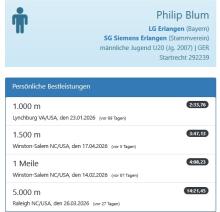 Seit kurzem haben wir einen neuen Top-Leister in unseren Reihen. Philip Blum wohnt in North Carolina (USA), ist Bahn-Mittel- und -Langstreckler und mit Geburtsjahr 2007 noch Jugendlicher der Klasse MU20. In dieser Klasse will er so ganz nebenbei - und daraus macht er kein Geheimnis - Deutscher Meister werden. Dafür hat er sich uns angeschlossen. Mit seiner jüngsten Leistung über 1500 m in 3.47,13 min (siehe Bild) hat er sich mal gleich für die entsprechende Weltmeisterschaft Mitte August in Eugene, USA, qualifiziert. Aber auch seine anderen Leistungen in 2026 von 1000 m bis 5000 m können sich sehen lassen, siehe LADV-Leistungsübersicht!