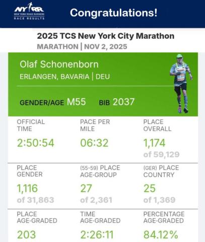 Olaf hat sich auf jeden Fall super durchgekämpft. Das verrät auch die Zusammenfassung zur Ergebnis-Statistik des TCS New York City Marathons (s. Bild): unter Einbeziehung seines Alters (“age group“ - hier alle, also nicht nur die WM-Teilnehmer) würde das einer 2:26 h (“age graded“) entsprechen und einem Gesamtplatz 203 von ca. 32.000 teilnehmenden Männern!