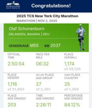 Darauf hatte Olaf schon länger hintrainiert, nachdem der DLV ihn ermutigt hatte, bei der Senioren-Weltmeisterschaft als deutscher M55-Top-Senior in New York zu starten. Alleine das hatte ihn hoch motiviert, die Reise in die US-Metropole zu unternehmen. Die sportliche Vorbereitung klappte einwandfrei, z.B. der gelungene Halbmarathon in Budapest, wo er als M55er mit dem Gesamtplatz Drei glänzte. In New York meisterte er alle organisatorischen Abläufe, die so ein riesiger Event mit 60.000 Teilnehmenden erfordert.
