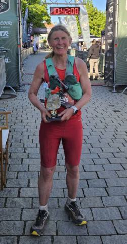 Nicht nur über 2760 Höhenmeter - und gefühlt noch mehr, da jeder denkbare Anstieg zu einer weiteren Bergauf-Bergab-Schleife führt, auch große Temperaturunterschiede mit nur 2°C am Start gab‘s beim UTFS. Es war trocken und griffig bergab und es wurde schnell warm; die Armlinge habe ich schon nach 8 km in Trainmeusel runter. Bin verhalten los, um am Schluss nicht büßen zu müssen, entsprechend leicht und locker flog die erste Hälfte dahin trotz Staus an Engstellen. Nach ca. 15 km konnte ich die 2. Läuferin in meiner Klasse, die 5 Jahre jünger ist, einholen. Sie wehrte sich energisch, aber schließlich bin ich bergab endgültig an ihr vorbeigehüpft. Die federnden Erdtrails waren wesentlich angenehmer und lockerer zu laufen, als die harten Wege beim Obermainmarathon. Immer den Puls im Blick versuchte ich mich für das bekannt harte letzte Drittel zu schonen. Aber es wurde unter der Mittagssonne knallheiß und mich erwischten wieder mal Magenprobleme, so dass ich die letzten 20 km nichts mehr außer kleinen Wasserschlucken zu mir nehmen konnte und folglich einen Gang rausnehmen musste. Ein paar kleinere Krämpfe ließen sich durch vorsichiges Treppaufsteigen beruhigen. Bergab machten die Beine noch mit, es blieb bei ein paar sturzfreien Stolperern und einem insgesamt guten Durchkommen: Eine Stunde schneller als 2024. Glücklich Im Ziel wurde ich als Senior Master Woman begrüßt genau an meinem 65. Geburtstag. Es war wunderbar und ein besonderer Geburtstag.